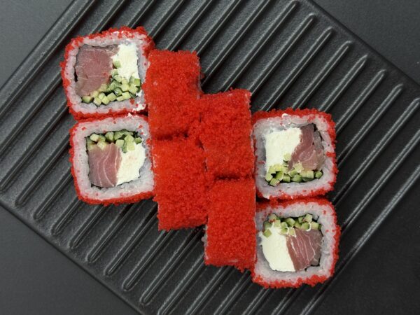 Нори, рис, сливочный сыр, огурец, тунец, икра масаго красная