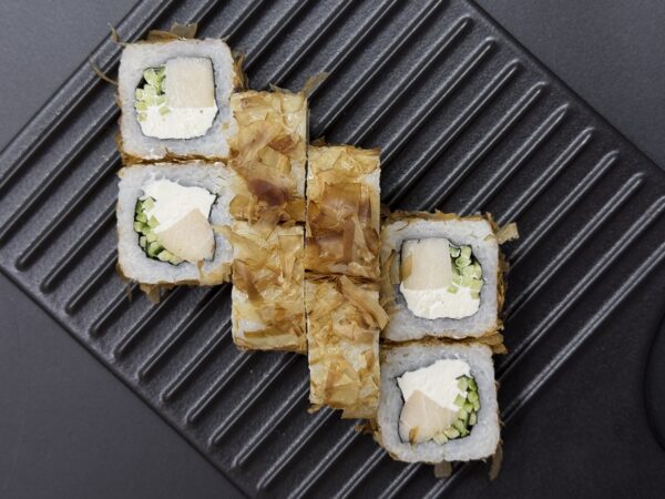 Рис, нори, сливочный сыр, огурец, масляная рыба, стружка тунца