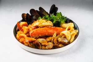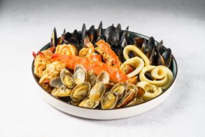 Мидии чилли, креветки тигровые, фаланги краба, вонголе, кальмар в сливочном соусе с сыром пармезан. Вес 1,5кг