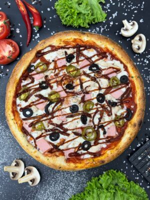 Красны соус, моцарелла, куриное филе, ветчина, вяленые томаты, перец халапеньо, маслины, итальянские травы, соус BBQ.