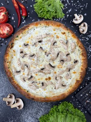Белый соус, моцарелла, куриное филе, грибы, итальянские травы.