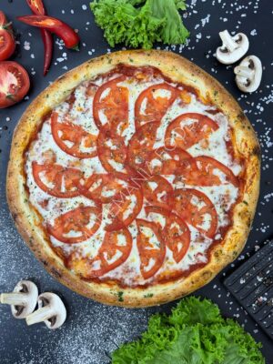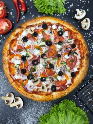 Красный соус, моцарелла, помидор, грибы, болгарский перец, красный лук, маслины, сыр фета, зеленый лук, итальянские травы, оливковое масло.