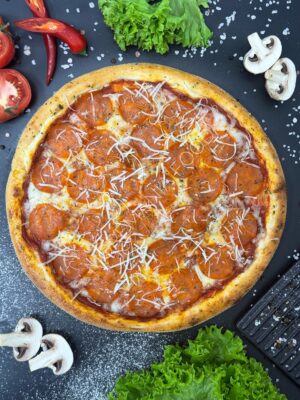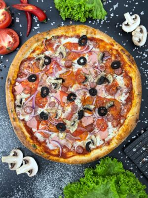 Красный соус, моцарелла, охотничьи колбаски, пепперони, бекон, ветчина, красный лук, грибы, маслины, помидор, итальянские травы.