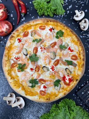 Соус Том Ям, моцарелла, лосось, креветки, мидии, помидор, икра Масаго, творожный сыр, зелень.