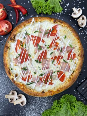 Белый соус, моцарелла, куриное филе, бекон, помидор, зеленый лук, соус чесночный ранч.