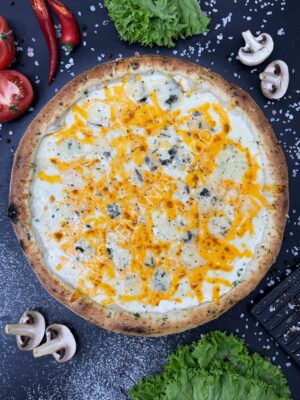 Белый соус, моцарелла, пармезан, чеддер, сыр с благородной плесенью, итальянские травы.