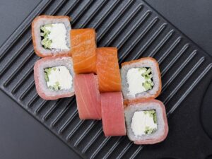 Нори, рис, сливочный сыр, огурец, лосось, масляная рыба, икра масаго