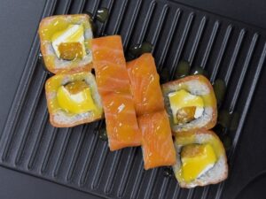 Нори, рис, сливочный сыр, манго, лосось, манго соус