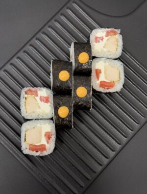 Нори, рис, сливочный сыр, тунец, лосось, помидор, соус BBQ