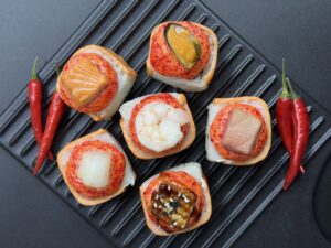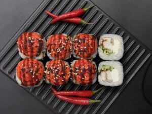 Нори, рис, сливочный сыр, тамаго, мидии, гребешок, тунец, угорь, креветка, лосось, спайси соус
