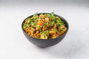 Рис обжаренный с куриным филе, морковью, кабачками, болгарским перцем, стручковой фасолью и шампиньонами с добавлением соуса терияки