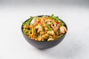 Рис обжаренный с миксом морепродуктов, морковью, кабачками, болгарским перцем, стручковой фасолью с добавлением соуса шанхайский