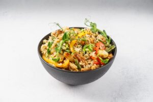 Рис обжаренный с куриным филе, морковью, кабачками, болгарским перцем, стручковой фасолью и шампиньонами с добавлением сливочного соуса