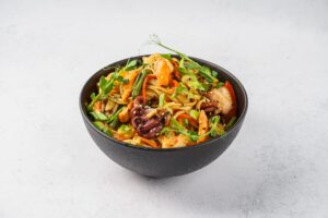 Лапша удон, морепродукты, болгарский перец, морковь, стручковая фасоль, кабачки, соус шанхайский, зеленый лук, кунжут микс
