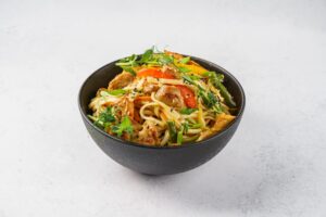 Лапша удон, куриное филе, болгарский перец, морковь, фасоль стручковая, шампиньоны, сливочный соус, зеленый лук, кунжут микс