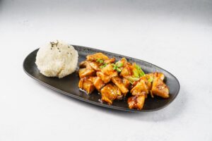 Филе окуня обжаренное в соусе терияки, подается с рисом