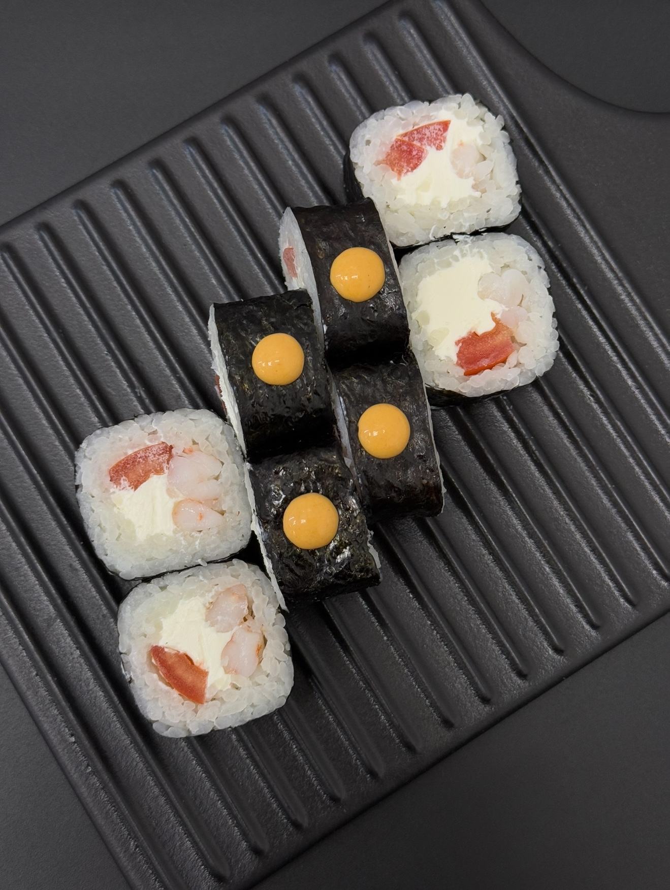 Нори, рис, сливочный сыр, манго, королевская креветка, манго соус
