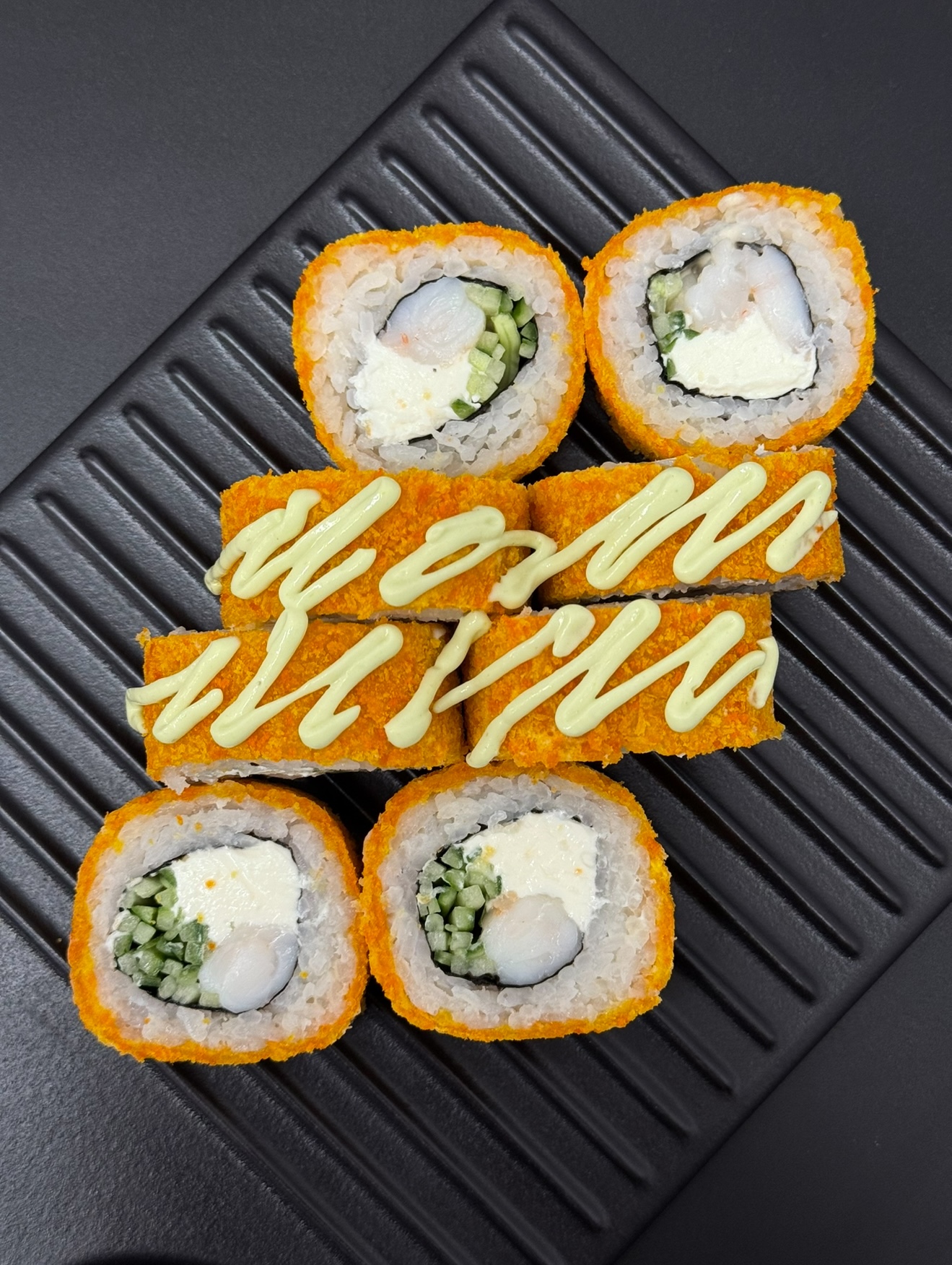 Нори, рис, творожный сыр, креветка, огурец, соус “Азия”, темпура