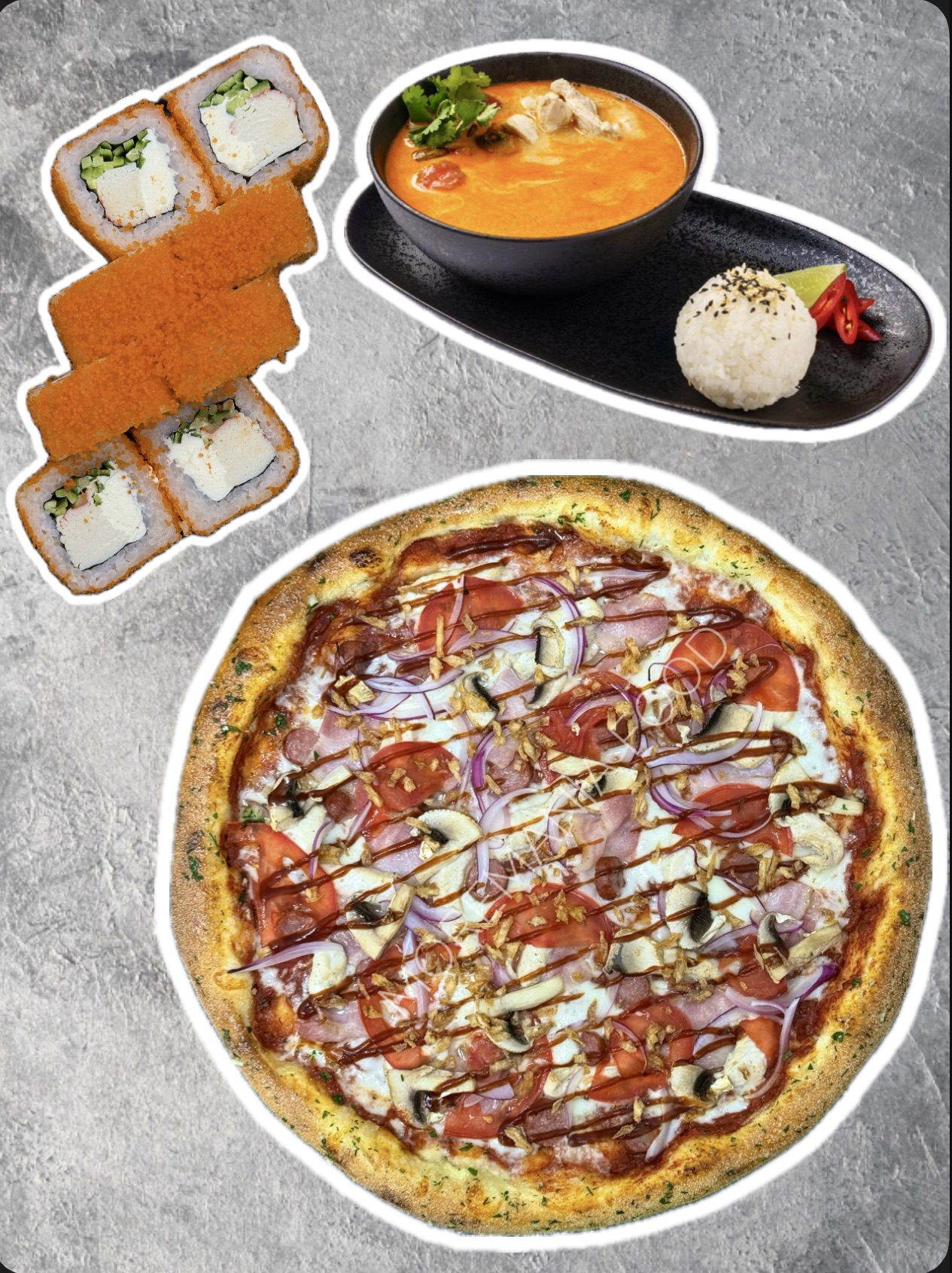 – Пицца BBQ – Калифорния с крабом – Том ям с курицей