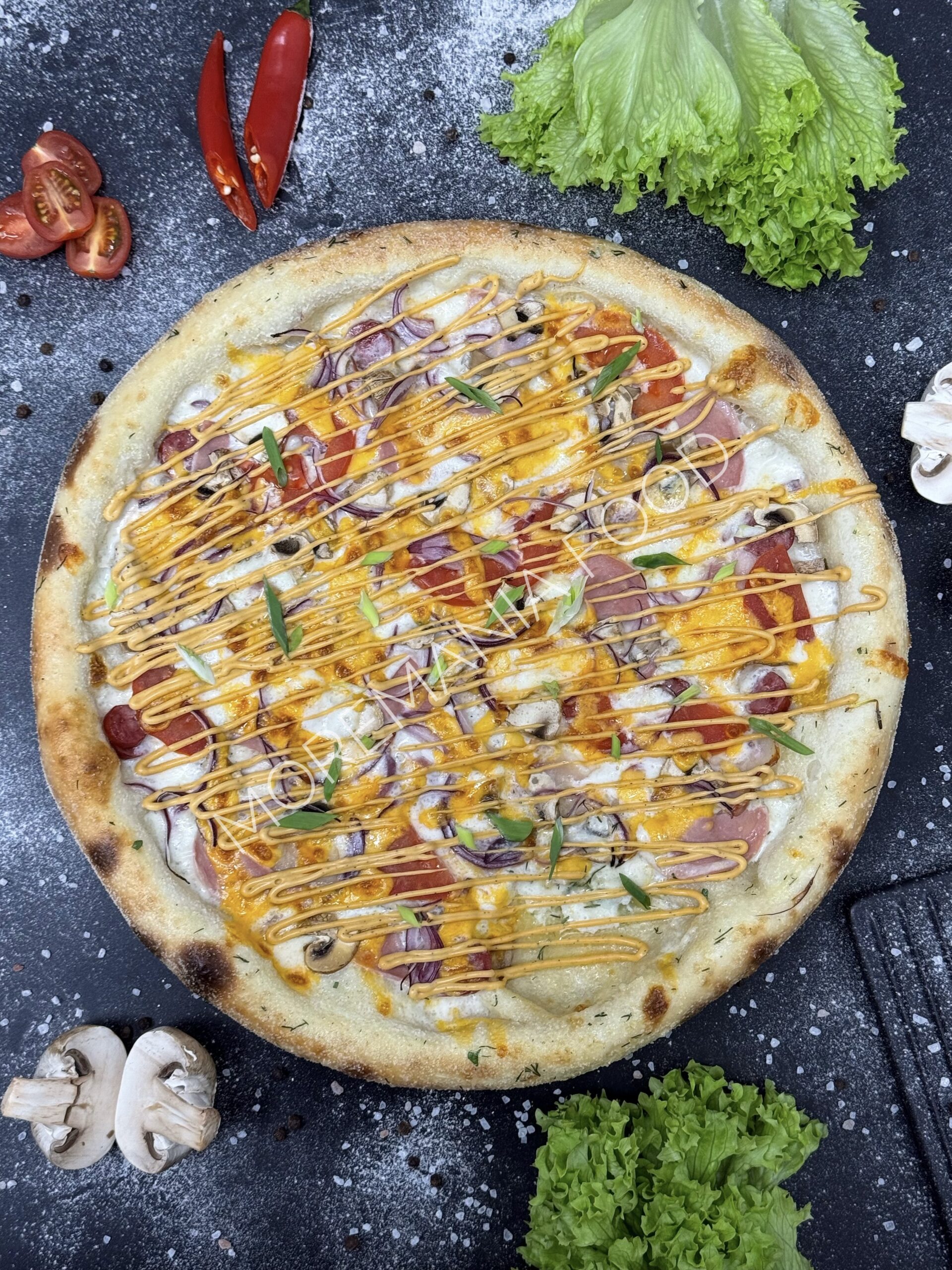 Красны соус, моцарелла, куриное филе, ветчина, вяленые томаты, перец халапеньо, маслины, итальянские травы, соус BBQ.