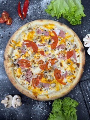 Белый соус, сыр моцарелла, сыр чеддер, ветчина,грибы,помидор, лук фри.