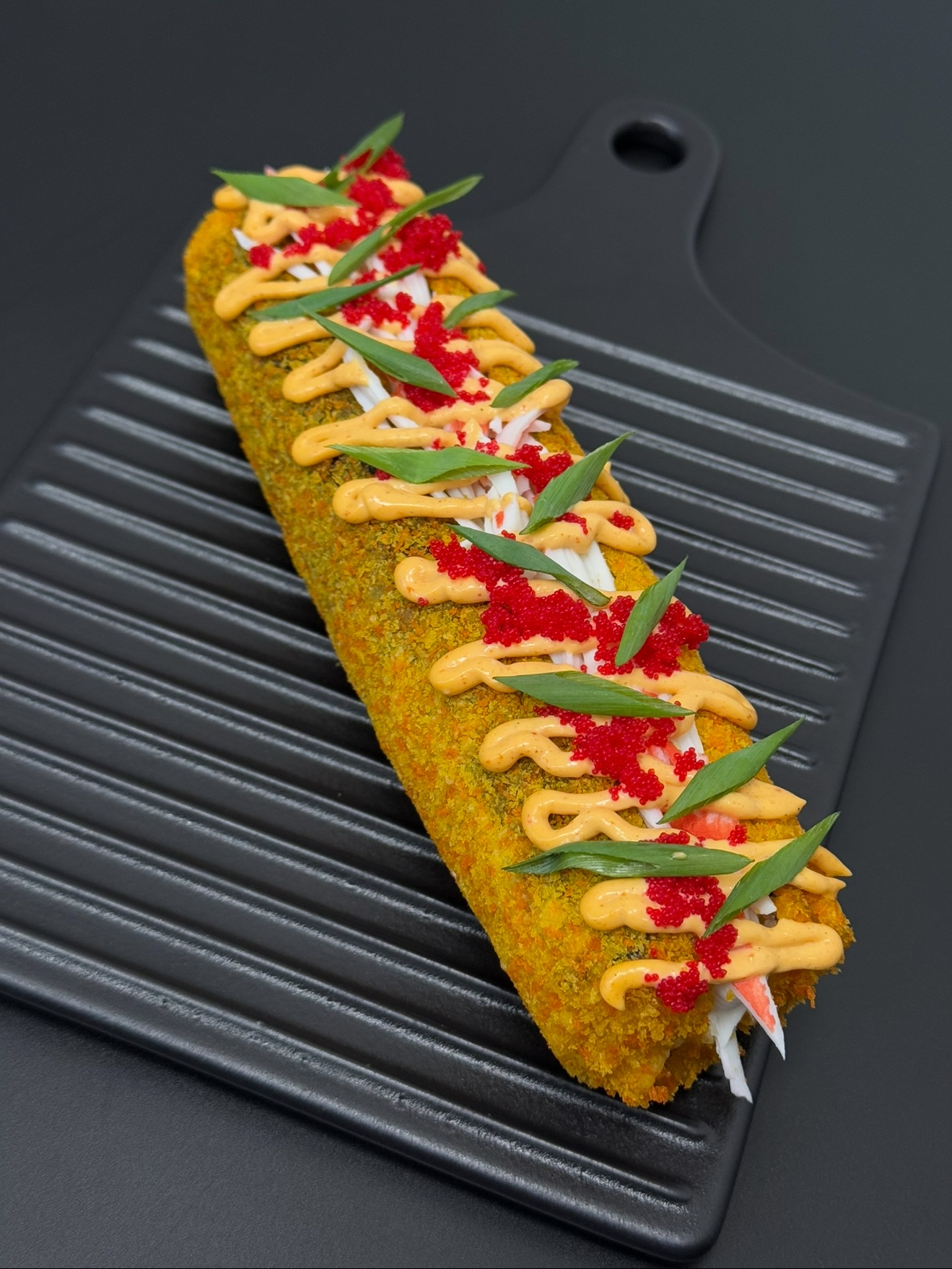 Нори, рис, творожный сыр, снежный краб, огурец, соус “Масаго”, темпура