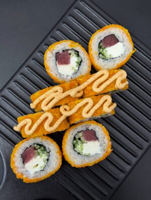 Нори, рис, творожный сыр, тунец, огурец, соус “Масаго”, темпура