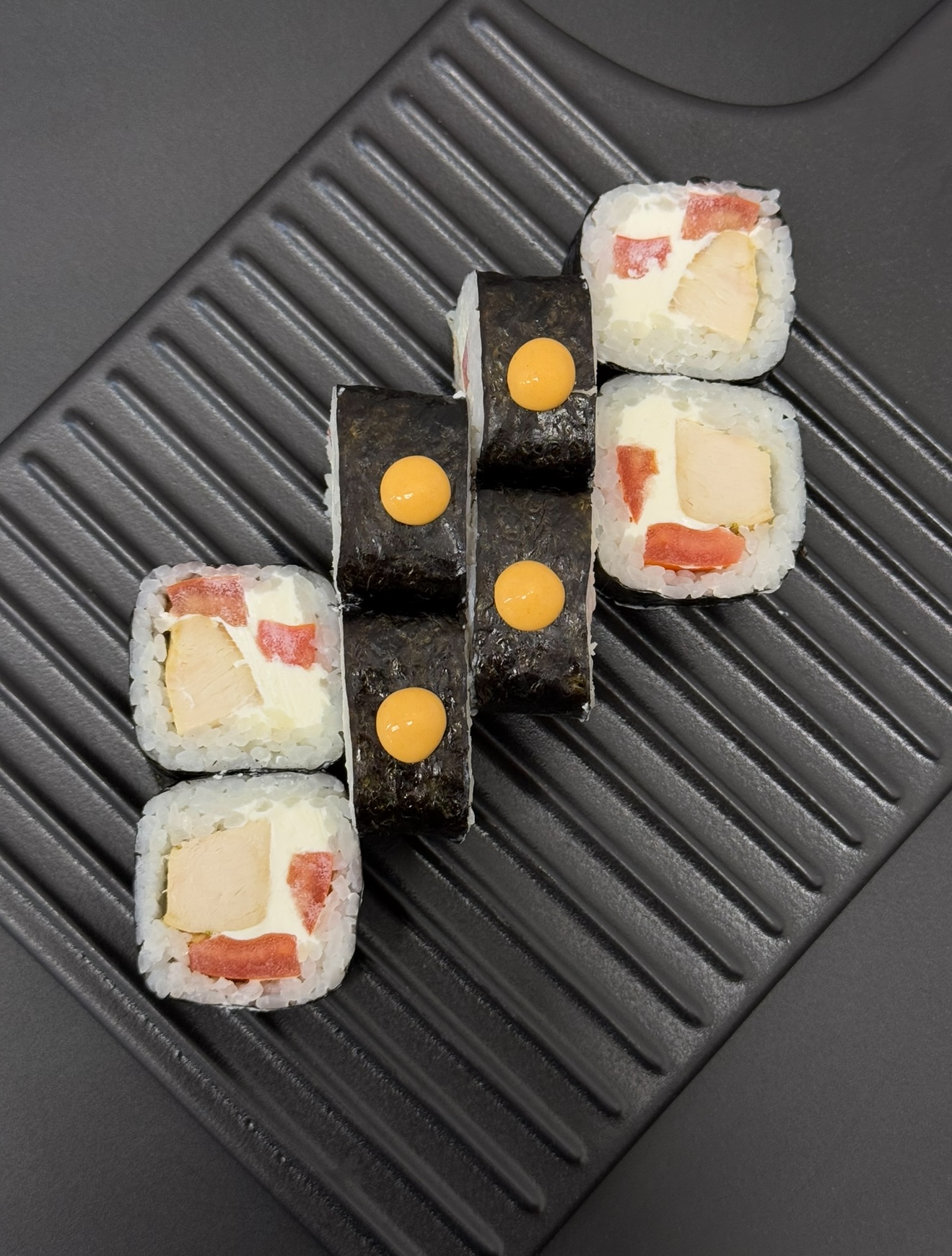 рис, нори, куриное филе, творожный сыр, помидор, соус том ям