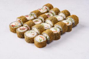Горячий ролл с лососем Горячий ролл с крабом Запечённый ролл с лососем в кунжуте Запечённый ролл с креветкой в кунжуте Филадельфия Лайт Ролл с лососем чиз